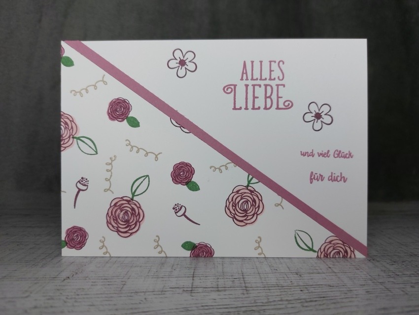 Grußkarte Alles Liebe und viel Glück handgemacht aus Farbkarton mit gestempelten Blüten und einem gestempelten Schriftzug.