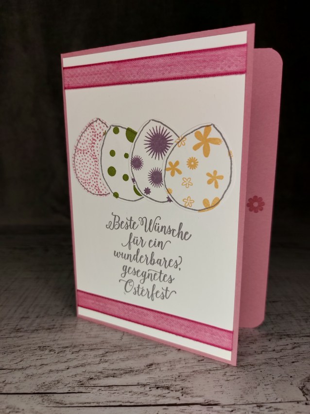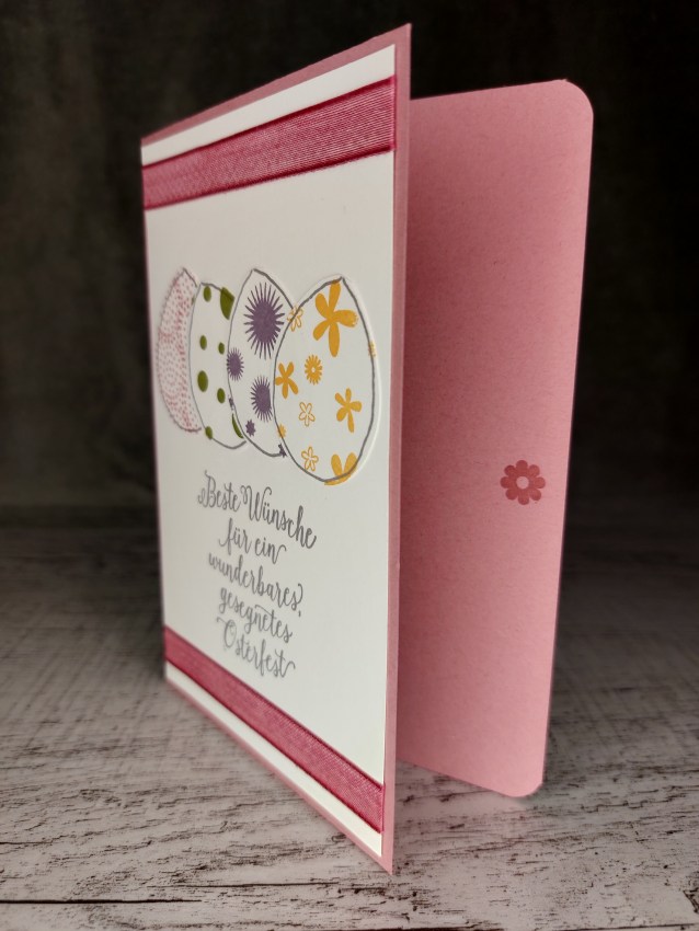 Grußkarte Beste Wünsche Osterfest handgemacht aus Farbkarton mit gestanzten und gestempelten Ostereiern und einem gestempelten Schriftzug auf der Vorderseite.