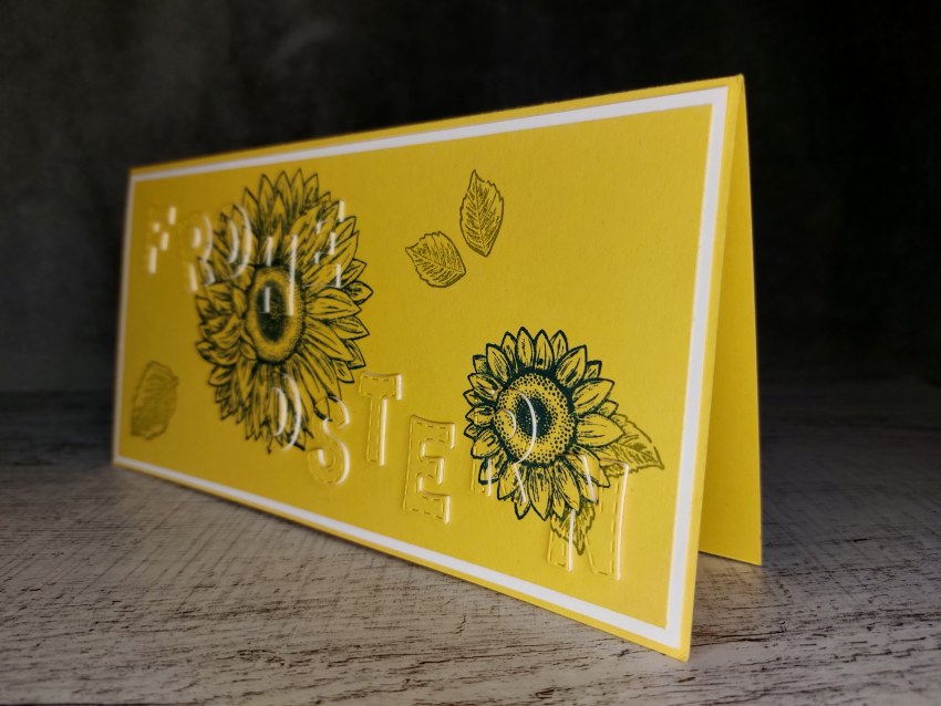 Grußkarte Frohe Ostern Blüten gelb handgemacht aus Farbkarton mit gestempelten Blüten und einem gestanzten und erhabenen Buchstaben auf der Vorderseite.