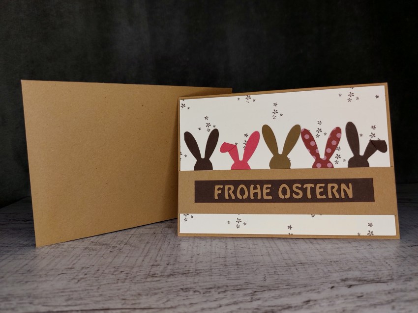 Grußkarte Frohe Ostern Ohren handgemacht aus Farbkarton mit gestanzten Hasenohren und einem gestanzten Schriftzug auf der Vorderseite.