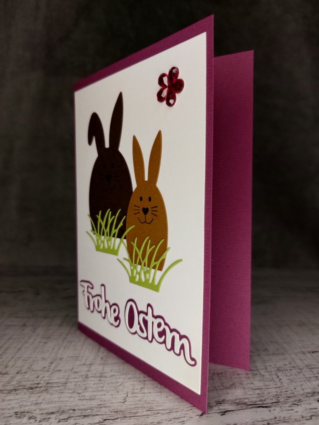 Grußkarte Frohe Ostern zwei Hasen handgemacht aus Farbkarton mit 2 gestanzten Hasen und einem gestanzten Schriftzug auf der Vorderseite.