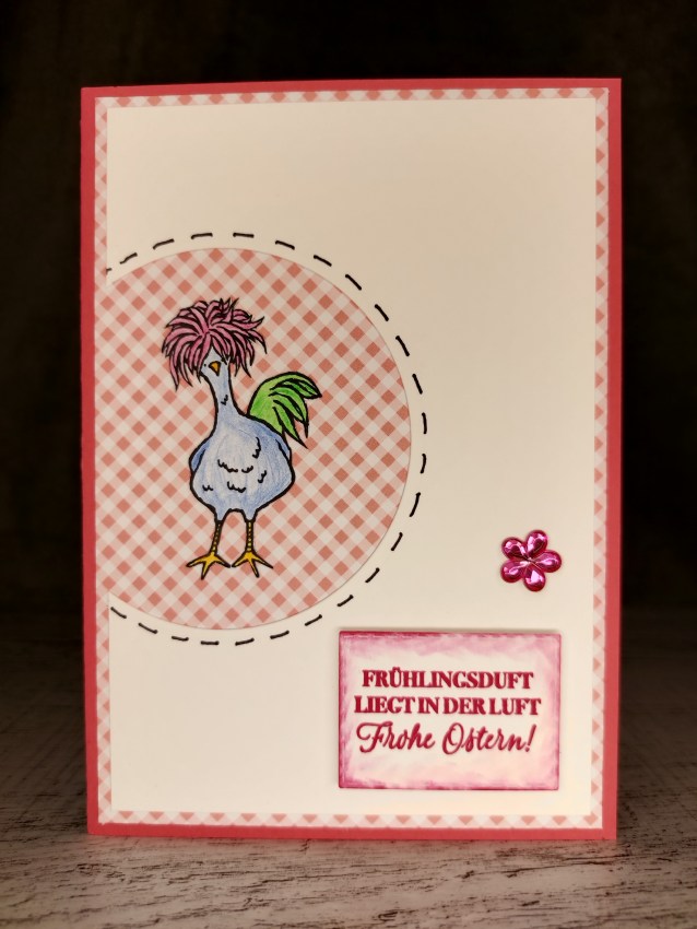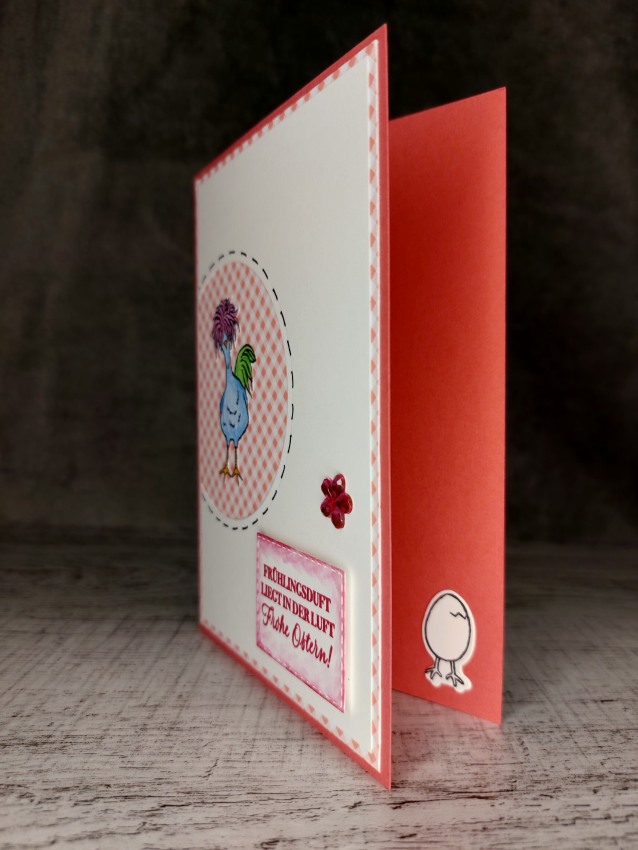 Grußkarte Frühlingsduft Huhn rot handgemacht aus Farbkarton mit gestanztem und gestempeltem Huhn auf der Vorderseite sowie einem gestanzten und gestempleten Emblem mit Schriftzug.