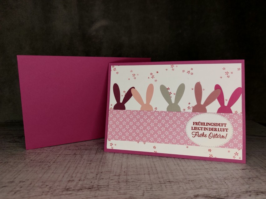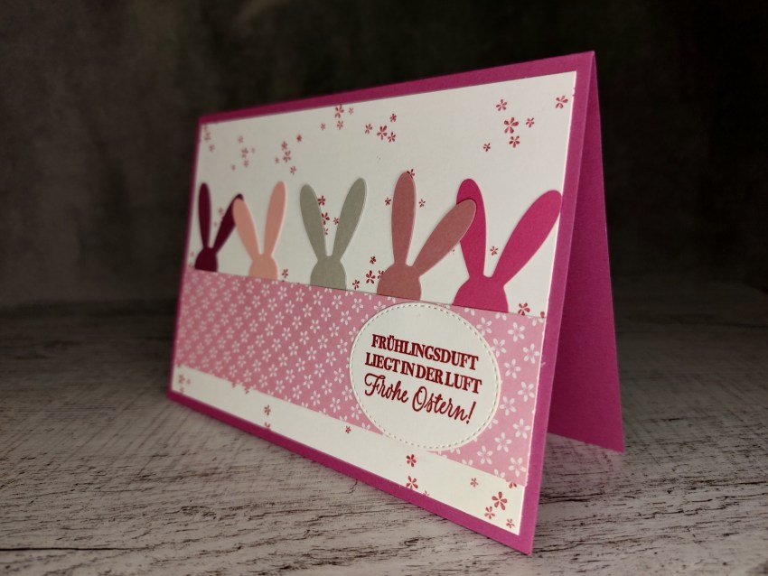 Grußkarte Frühlingsduft Ohren handgemacht aus Farbkarton mit gestanzten Hasenohren und einem gestanzten und gestempelten Schriftzug auf der Vorderseite.