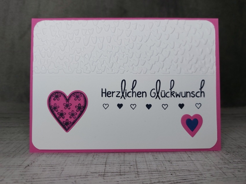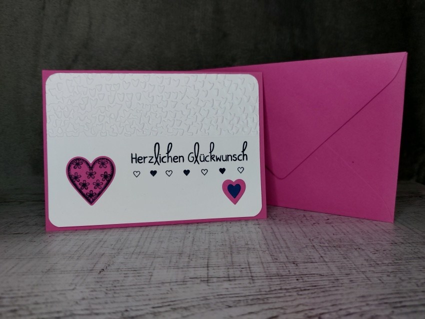 Grußkarte Glückwunschkarte Herzen handgemacht aus Farbkarton mit geprägten und augestanzten Herzen sowie einem gestempelten Schriftzug.