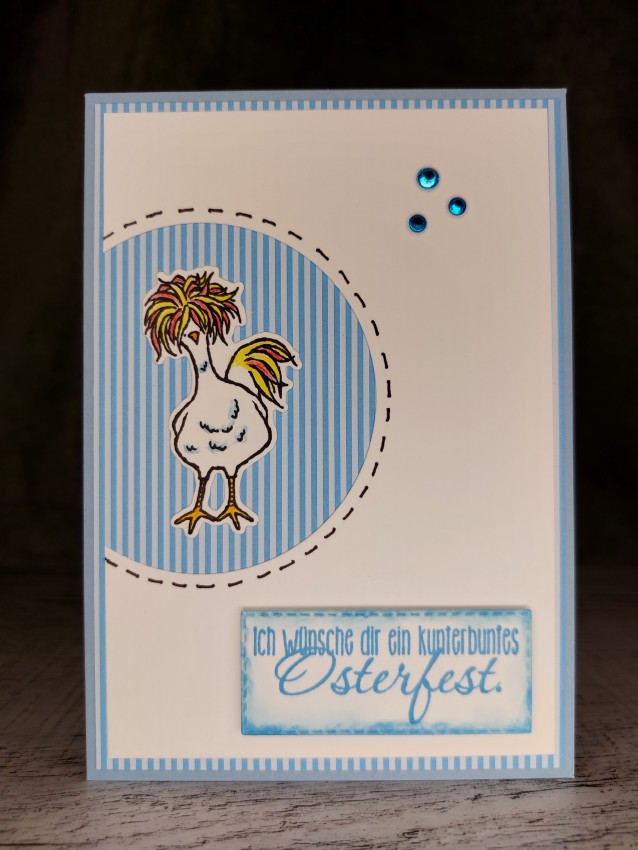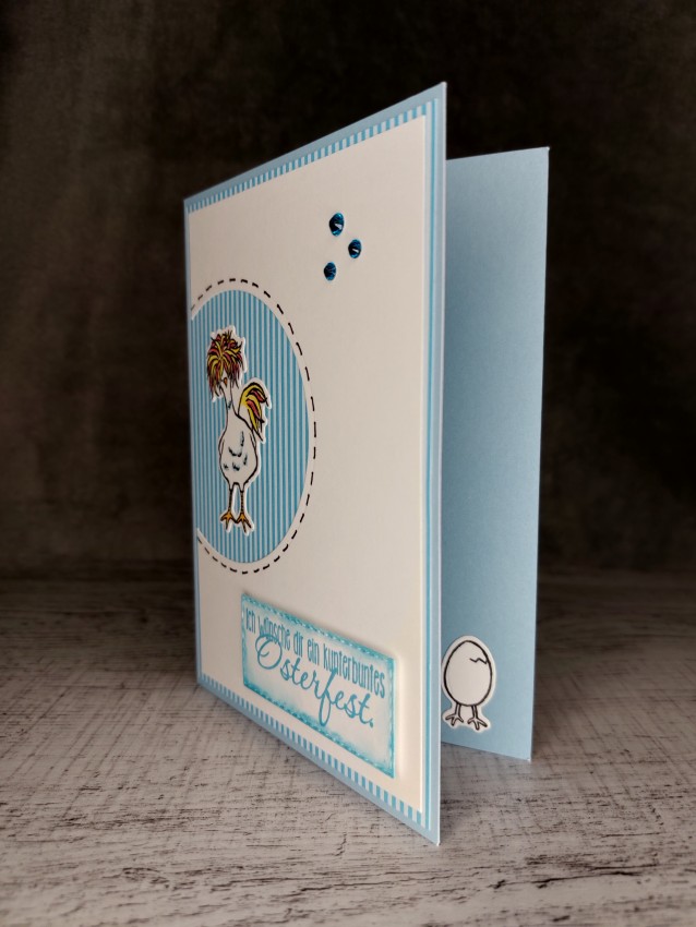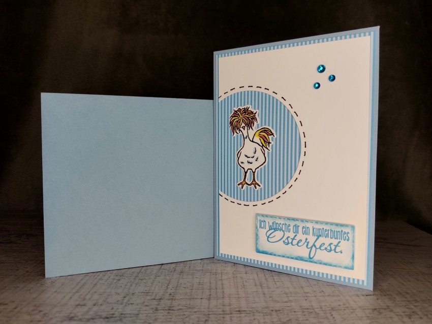 Grußkarte Osterfest Huhn blau handgemacht aus Farbkarton mit gestanztem und gestempeltem Huhn auf der Vorderseite sowie einem gestanzten und gestempleten Emblem mit Schriftzug.