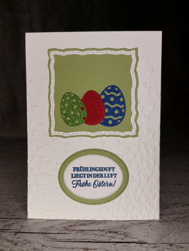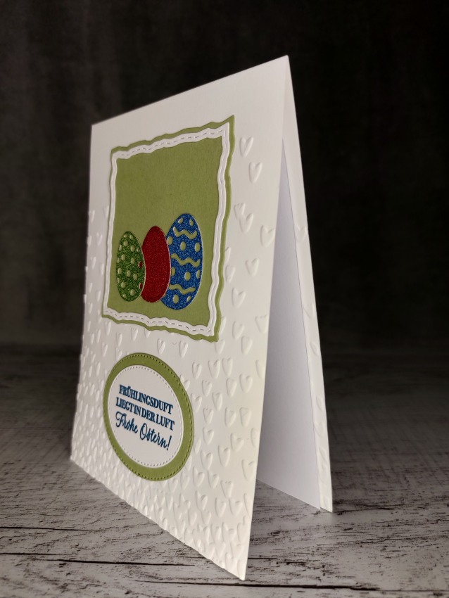 Geprägte Grußkarte Ostern Frühlingsduft Eier handgemacht aus Farbkarton mit gestanztem Emblem und Eiern auf der Vorderseite sowie einem gestempleten Schriftzug.