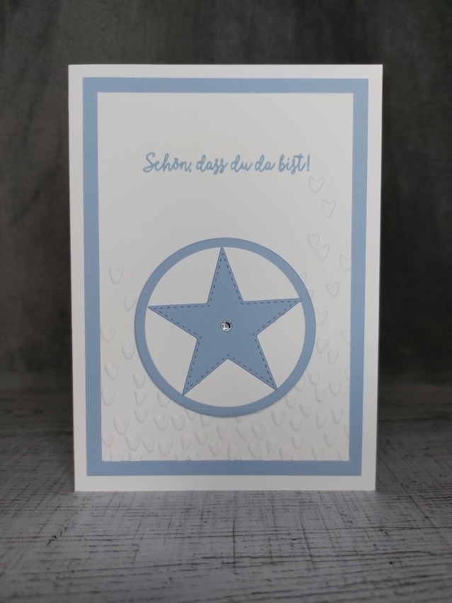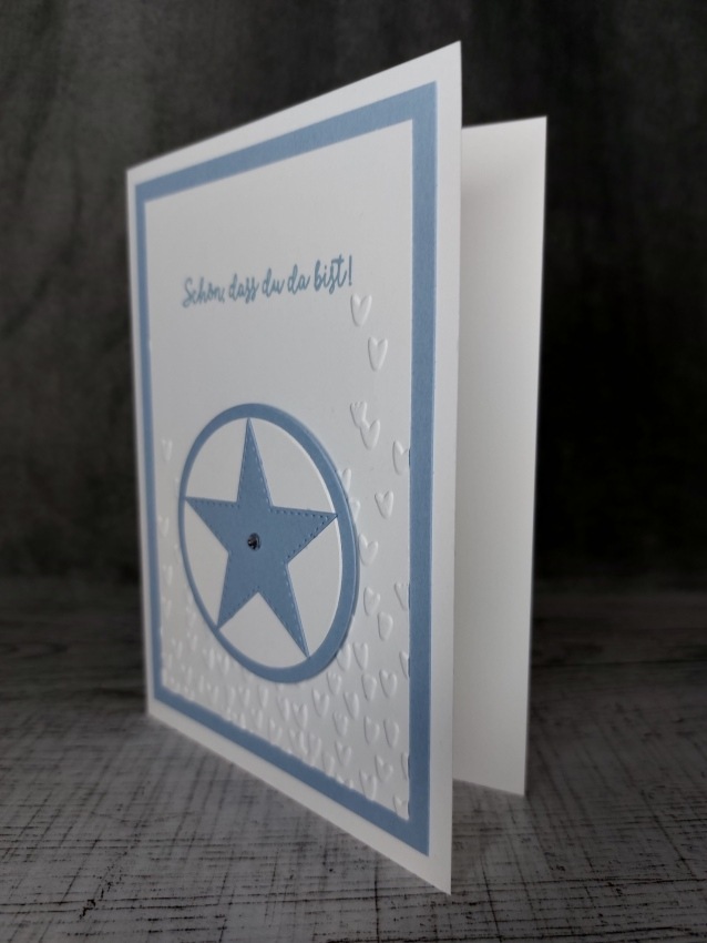 Grußkarte Schön dass Du da bist handgemacht aus Farbkarton mit geprägten Herzen, einem ausgestanzten Kreis mit Stern und einem gestempelten Schriftzug.