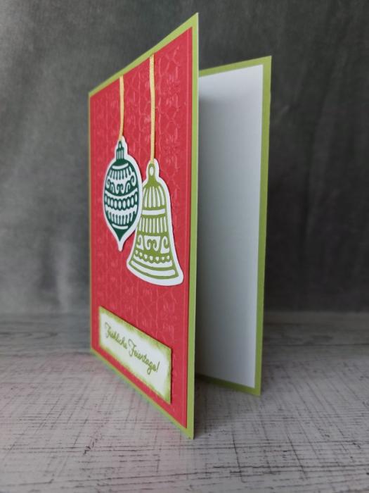 Grußkarte Weihnachten Feiertage handgemacht aus Farbkarton mit geprägter Vorderseite und ausgestanztem Weihnachtsschmuck sowie einem gestempeltem Schriftzug.