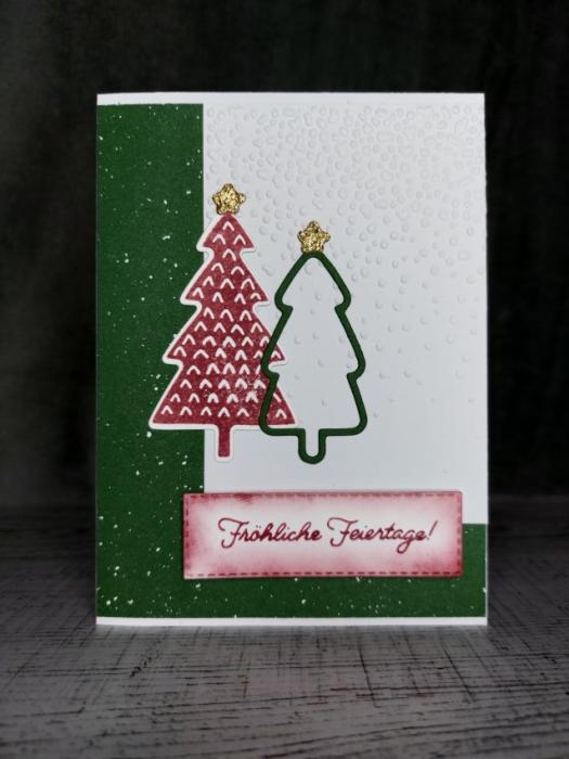 Grußkarte Weihnachten Fröhliche Feiertage handgemacht aus Farbkarton mit geprägter Vorderseite und ausgestanzten Weihnachtsbäumen sowie einem gestempeltem Schriftzug.