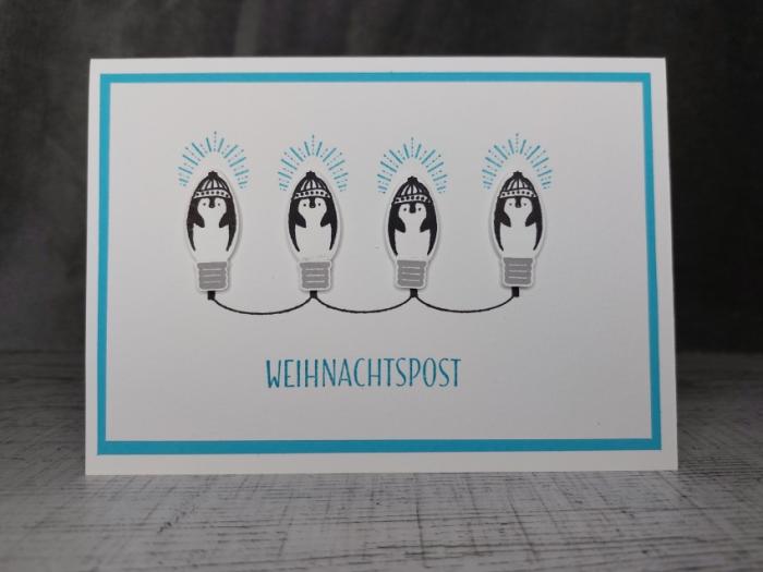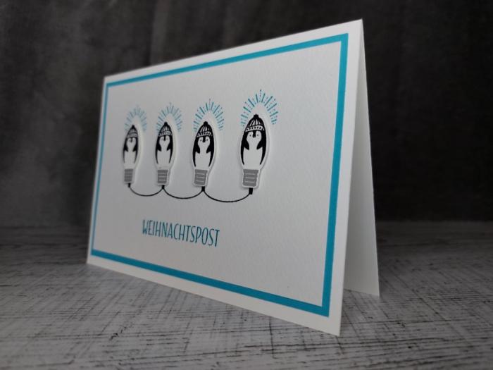 Grußkarte Weihnachten Post Pinguin handgemacht aus Farbkarton, mit ausgestanzten und gestempleten Pinguinen sowie gestempeltem Schriftzug.