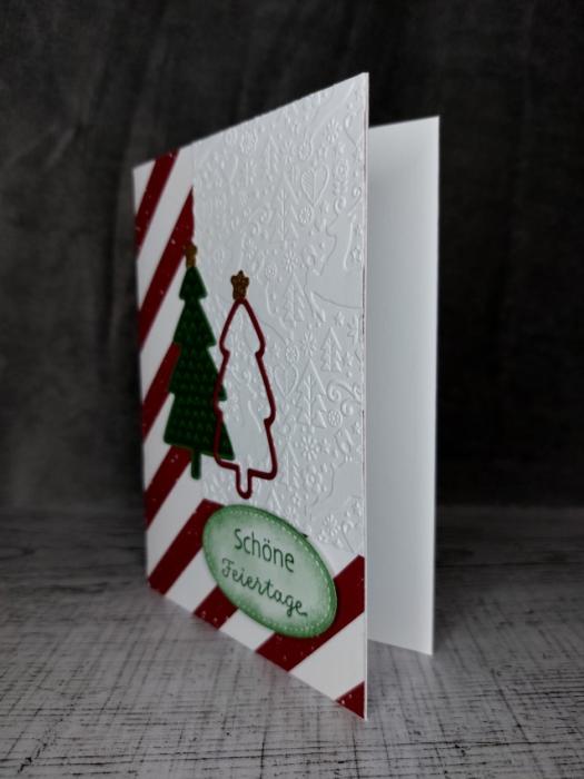 Grußkarte Weihnachten Schöne Feiertage handgemacht aus Farbkarton mit geprägter Vorderseite und ausgestanzten Weihnachtsbäumen sowie einem gestempeltem Schriftzug.
