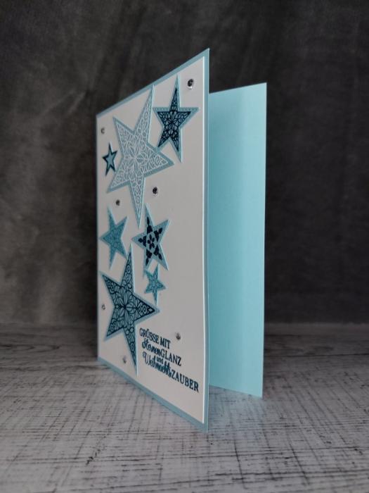 Grußkarte Weihnachten mit Sternen handgemacht aus Farbkarton mit ausgestanzten, gestempelt und embossten Sternen sowie einem gestempeltem Schriftzug.