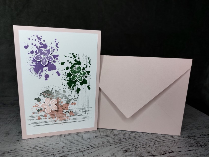 Grußkarte mit Blüten Rosa handgemacht aus Farbkarton mit 3 ausgestanzten und gestempleten Blüten.